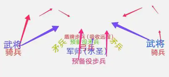 敌方武将冲过来,预备役矛兵上围住武将,当对方步兵矛兵全冲过来的时候,军师放水圣。