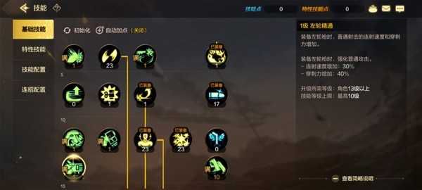 漫游转职之后会获得左轮精通和快速填装技能,在装备左轮枪时能够获得强化效果,同时25级之后能够学习的增益技能“左轮暴击”也能够在一定时间内提高左轮枪的暴击伤害。