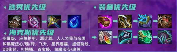 开局选秀拿取的装备最优就是拳套与大棒,次选宝剑、水滴,第一个海克斯强化如果有羽量级、帝国与黑魔法师相关的海克斯最优。