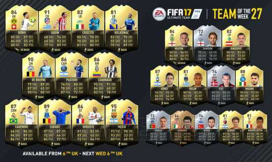 在每个星期的《FIFA17》UT模式都会汇聚来自世界各地的国家队、俱乐部的顶尖球员。这个队伍可供玩家进行挑战。那么下面小编为大家带来第二十七周的最佳阵容,由本周阵容由梅西、卢卡库领衔,大家来看看吧!