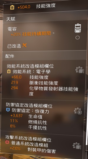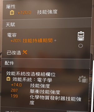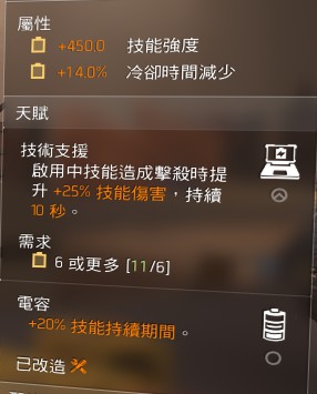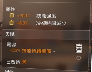 不同的是,除了手套没法换电容天赋之外,其余天赋全部用电容,背包另一个天赋随意的,最好是【技术支持】(启用中技能造成击杀则在10秒内增加25%技能伤害),手套用【终结】(损耗敌人装甲时在15秒内增加35%技能伤害)。