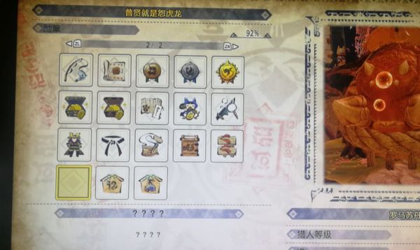 第一页第一排的勋章整体来说都是主线相关的东西,从称为猎人到村毕业再到集会所毕业,最后打完雷神龙就全部拿完了。