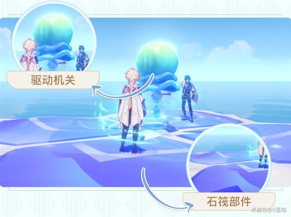 ·拾取「修复部件」和「飘曳能量」修复石筏及时补充机关所需要能量。此时必须停留在石筏之上。