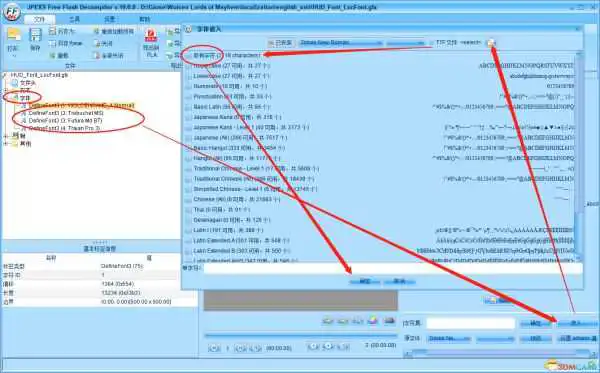 打开 JPEXS Free Flash Decompiler , 直接将上面改好的文件拖入,打开后展开左边的"字体"分类,有几个项就改几个项,一个一个改。