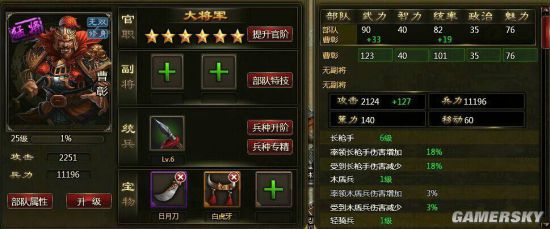 3、兵种专精等级越高,率领的兵种部队造成的伤害越高,所受到的敌方同兵种部队的伤害越少,可以在砺兵府使用练兵符和五铢进行升级。