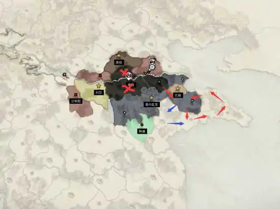 正常的进攻路线是红色箭头,蓝色箭头是当运气十分好的时候,刘备没有兵在琅琊主城旁可以直接先拿琅琊主城,从而达到完美开局。