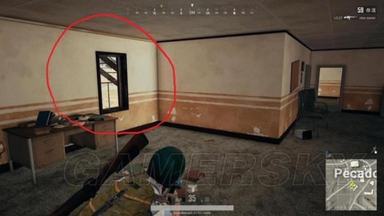 另外许多萌新对不知道怎么去写字楼顶楼,只需走楼梯上到写字楼最高的一层,走图上红圈的窗口就可以跳上楼梯,上楼顶。楼顶视野极佳,是Pecado的制高点,组排时,可以考虑让一名拥有高倍镜的队员上楼顶架枪、观察报点,但同时也要注意被各房屋类的LYB偷袭。