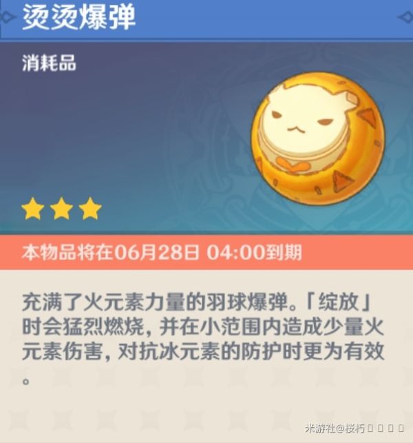 烫烫爆弹俗称开盾神器,用来丢给大冰史莱姆和冰盾丘丘人,这破盾速度还要什么自行车啊!