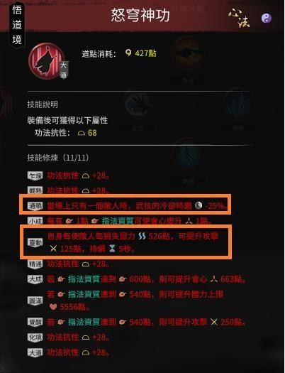 除此之外,目前很多套路普遍流行搭指神功,一般来说非指修却用指神功,通常是想贪那个第一条词缀「单一敌人时武技减cd」,所以神魂用蛟龙或勾陈都是可以的更正一下(感谢道友的提醒),指神功的关键词条如下: