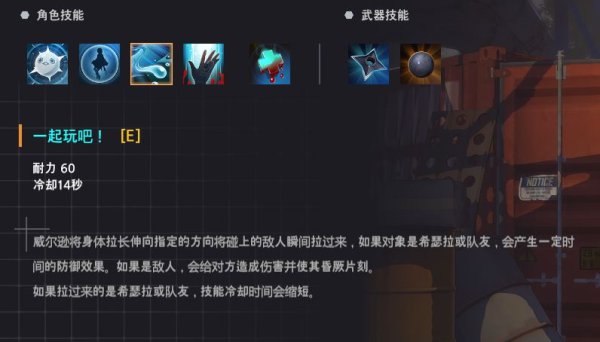 E技能,从球的中心向你鼠标指向的方向进行释放,拉到敌人会眩晕,拉到自己会进行位移和获得护盾。(qe技能可使自己穿墙)。