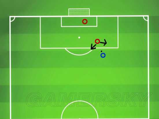 喜欢看球踢球的朋友都知道现实足球中我们通常喜欢会把对手赶到边路,这样我们便于实施围抢和堵截对手。那么在FIFA中我们的理念是一模一样的,尝试把对手赶到边路,然后使用边路双重盯人堵截和围抢。所以我们需要告诉对手你要往哪儿走,但是对手必然不会乖乖听话,那么我们如何做到让对手乖乖走向边路呢?这个如果看球多和踢球多的朋友应该很好理解,不过没关系,我们来讲解两幅案例图片来帮助你。