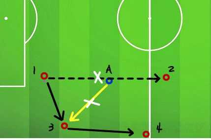 图三中,蓝色队员A明显陷入防守不利状况,那么我们该如何将威胁化解到最小化呢?首先,队员A没有去上抢队员1也没有跑向边路队员3,而是先使用准则⑴将队员1和队员2隔开切断这两人的传球路线,如果我们跑向边路队员3身后会有大片空挡,队员2接球后会去组织进攻,非常危险,千万不要给对手空间。随后队员1看到已经无法传球给队员2之后选择将球传给了队员3,这时候我们该如何做?用队员A一直隔开队员3和队员2的连接,切断他的传球路线,不给他中路空间。如果他将球传给队员4,立即使用边路盯人策略。如果他又将球回传给了队员1,那么此次防守已经成功,因为你把对手的空间全部压缩干净,导致这次中场4V1也无法顺利通过中场给你的后防线造成压力。