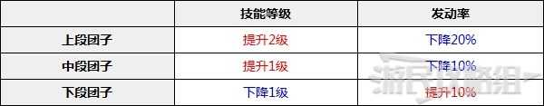 跃动竹签会改变团子的技能等级和发动率,有升有降,想要提高技能效果的话可以放在上段和中段。
