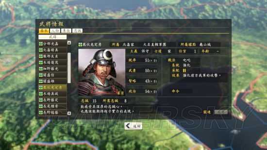 剑豪型,初始奋起加剑豪,全3出快奔,统武4出枪术,统武8出先驱,统武16出猛将。剑豪型的武将就是用来做副将的,可北畠家全家上下就这货统武最高,还是大名,除了用他没别的人才了。最蛋疼的是31的智力,只能强攻,等后面抓到牛人了,直接联姻退位,让他安静的做个副将吧