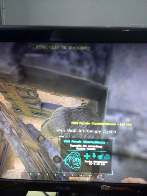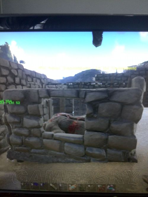 但是发现就算在窗外喂,被它正面看到还是会进战斗(战斗状态不能喂)。于是灵机一动,试试从头顶喂行不行。就造了上图的建筑格局。然后就成功了,头顶上它看不到你,趴着一直喂直到站起来。