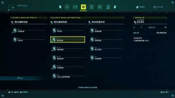 DUMA可以携带一个地图技能(扩大扫描范围或者减小被侦查范围)和三个被动技能(比如攻击的能力回复量),此外DUMA还存在一种“张开结界”提供BUFF的模式,不过作为代价的话就是失去了VA能力,需要玩家进行取舍。