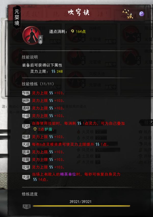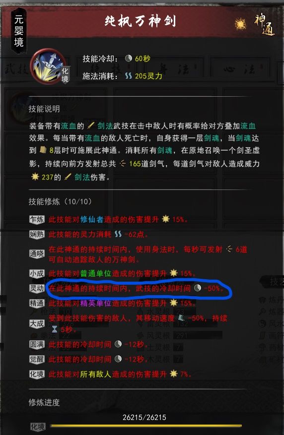 然后是神通万剑诀 使用神通期间,武技CD减少50%。