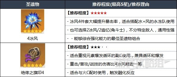 「冰风迷途的勇士」四件套是神里绫华作为主C时最适合的圣遗物,其能力在「绫华/水/冰/风」的永冻阵容中非常强大,在战斗期间能够充分运用到四件套的效果来提升输出。