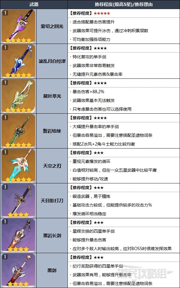 五星武器中最推荐的是「雾切之回光」,能够压倒性地提高伤害。绫华选择4冰风、冰共鸣能够确保暴击,能够提升暴击伤害的「雾切之回光」时最容易平衡暴击/暴伤的武器。