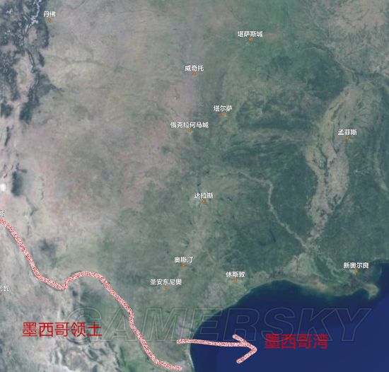 通过上图看到,现实上墨西哥领土根本不与新奥尔良接壤,但由于游戏是高度浓缩的,或许会以河流或湖泊来隔开沙漠与沼泽,从而也使这两个截然不同的地形看起来更合理些,如下:
