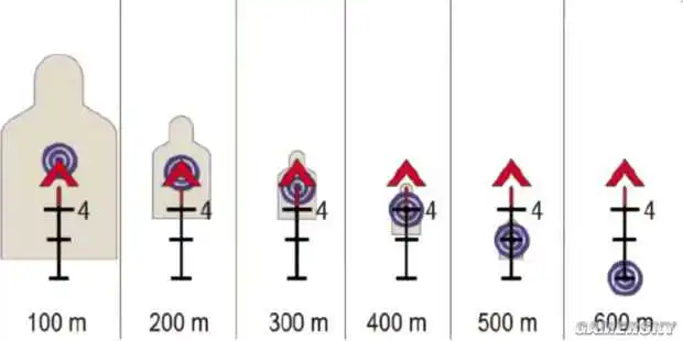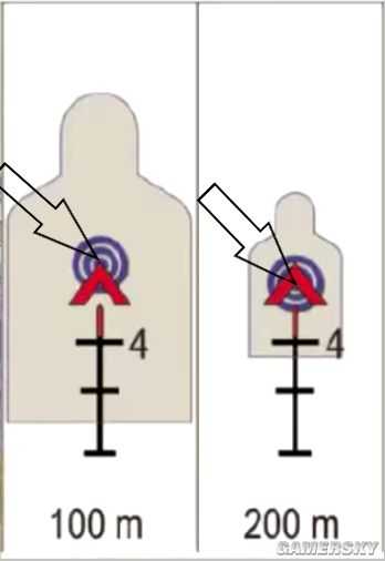 简单说,100米范围内,三角形上面一点点点点就是准心,基本大家都这么用也知道,200米的敌人就要用三角形下面(将红三角理解成两个箭头,用下面箭头的顶端瞄准)。