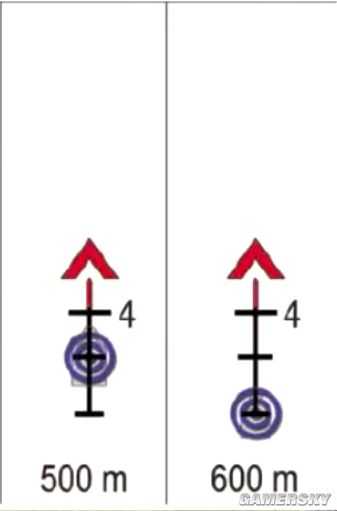 600m第三条黑色横线的宽=敌人的肩宽时,敌人的位置处于600m。