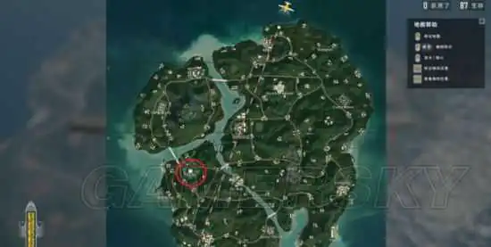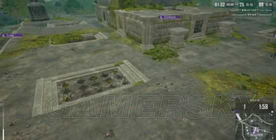 这里说的外围小平台是指上图中红圈所示的遗迹正前方平台。当我们飘伞位置不利,不能第一时间保证抢占主宫殿的情况下,落在这里是最好的选择。之所以选择这里是因为这处平台共有三个小建筑,保证我们可以落地拿到步枪以及基本的防具。而其他的平台就保证不了资源的刷新了,有可能在其他的地方你只能拿个喷子杀敌了。我们在搜索了红圈位置之后。就可以伺机向主宫殿前进了,一步步蚕食整个区域。