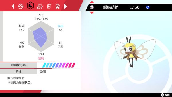 努力值极速满特攻,其更高的特攻种族让萌虻可以比风妖精更安定地击杀腮鱼龙及三首恶龙等弱仙宝可梦。