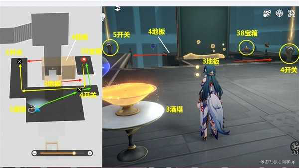 (5)接着用【4开关】将【3地板】移动到右边过去拿了【38宝箱】后,再去【5开关】处将【4地板】移动到左边