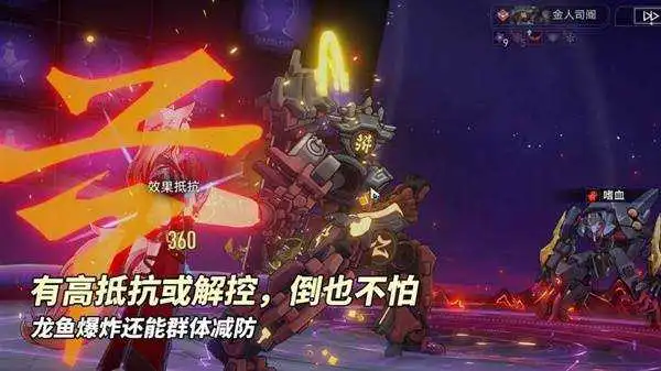金人司阍会在我方施放3次战技/终结技后,立马召唤2只灯昼龙鱼,并拉条自身。好处,龙鱼自爆时降低敌方全队30%防御;坏处,期间金人有单体高概率禁锢技能。无瞬秒能力则建议带解控型队友,避免被控制,拖缓你的对局节奏。