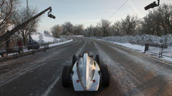 在冬天,不仅冰雪覆盖了路面,平时的湖面也都结了冰,成为了越野可能跨越的地形——而滑出赛道会导致更强的车辆失控而造成更严重的后果。在高性能显示器的HDR10技术和RGB广色域的精准色彩显示下,可以看到路面的效果非常出色,连冰凌的痕迹都栩栩如生,如果不是远方的树木稍显粗糙甚至会感觉自己身处真实的赛道而非游戏世界。