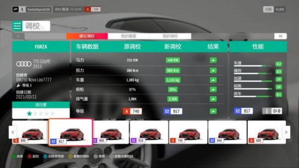 车辆的购入只是车辆养成的第一步——车辆按性能分为车速、操控、加速、起跑、刹车等属性,即便是同一款车型,随着调校的成果好坏,其在性能方面的差异还是非常显著的,玩家既可以根据自己的喜好进行手动的调校,也可以直接别人的调校成果(如上图示例),当然,性能调校大多是涉及到零部件的购买的,在自己中意的车入手之前,也可以省着CR点先凑活用。