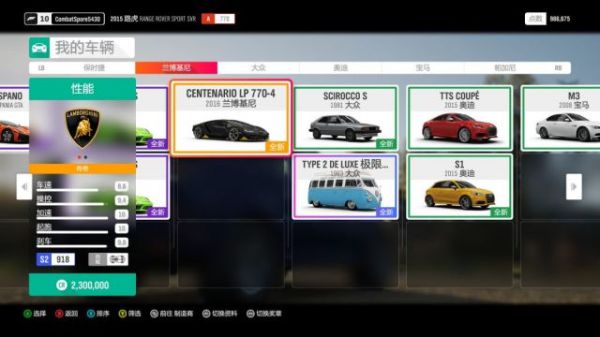 最终经过一段时间的游戏,原先空空如也的车库就开始熙熙攘攘的热闹起来了——车辆按品质分为多个等级,可以看到上图中的一代神车兰博基尼LP770各项数值都接近10分(这还是没调校过的),这款车在地平线3中就是最好用、最适合新人的车型之一。