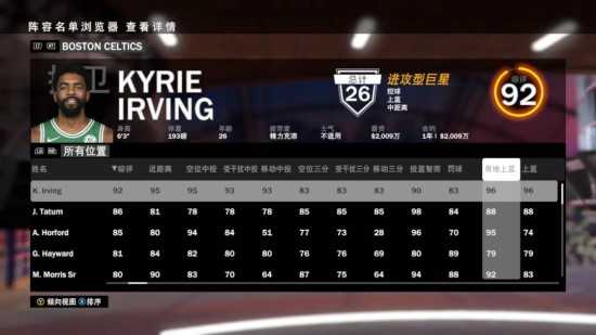NBA 2K19的凯尔特人如现实一般,每个球员都很均衡,从欧文、霍福德,到替补端的海沃德、罗齐尔,都是可以用来得分的武器,也都能在防守端贡献一份力量。