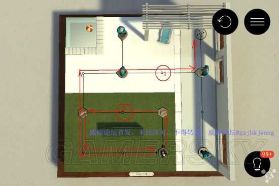 不杀一人的解法:沿路走到1号石头处往1号红圈扔石头,再走到2号石头处往2号红圈扔石头,然后往左走到3号石头处往3号红圈扔石头(这时大部分守卫都被吸引到2号红圈处了),接下来不用管守卫了,沿所示线路过关即可。