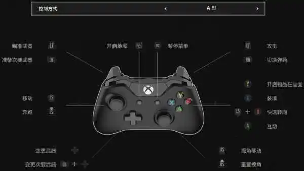 手柄操作有A、B、C三种操作类型可选,其实区别不大,主要是奔跑的操作不同。习惯老版生化2操作方式的可以选择B型(LS + B奔跑)。