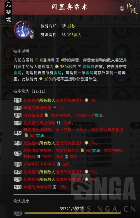绝技:只有三个有用的,打怪用奔雷术-34%左键CD足够应付一切,打登仙NPC可以换崩山掌或者寒霜爆配合一拳或者排云掌。