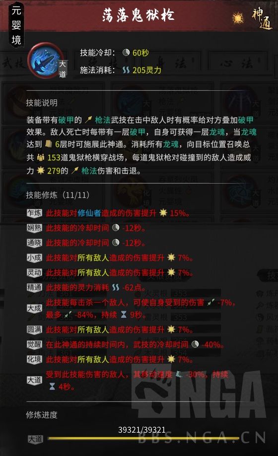神通:这里强烈推荐用枪神通鬼狱枪代替万神剑打登仙,这个技能有-40%CD,虽然比万神的-50%少,但打登仙时在刀,指,拳有25+25+12=62的情况下,加上40就已经过100了,足够把绝技换成寒霜掌,而这招自带击退,持续时间也比万神剑要长3秒左右,打登仙时非常好用,尤其配合排云掌的话,不带盾的登仙根本进不了身都是随便打。(注意这招有个武技带70%击退的词条最好不要带,太影响输出)。