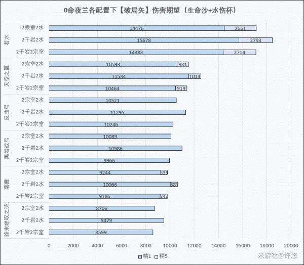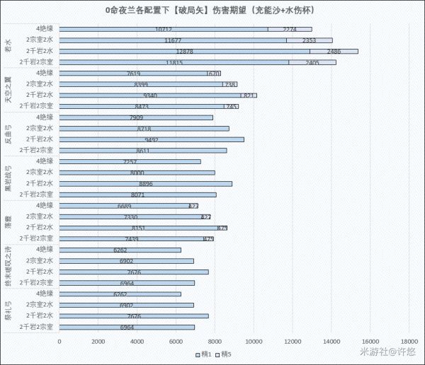 可以看出,各2+2方案的差距并不是很大,因此还是建议大家根据副词条的情况灵活选择。客观而言,更推介0命夜兰选择充能流派,以降低充能压力,低命座夜兰由于1命效果的存在不太缺充能,可以选择2宗室主打Q的后台伤害。夜兰除非满命,否则释放【破局矢】的次数其实非常有限,不建议围绕【破局矢】搭配;满命夜兰则可以围绕【特殊破局矢】进行圣遗物的搭配,抛弃2+2选择4水套。