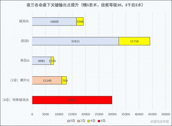 夜兰的命座其实对于伤害提升比较有限,更多的是降低自身充能压力,提升对特定队友的辅助能力以及提升后台输出伤害。在战斗过程中,夜兰具有伤害总量高,输出稳定持续,时间跨度长的特点,对于这种输出模式的伤害计算一般来说是不适合将全部倍率汇总的,因为该过程中闪避、移动、切换角色放技能等都会对输出总量产生影响。这部分的命座提升就不算总输出了,只计算关键输出点的伤害期望,以供大家参考。(以精1专武,技能等级10,2千岩2水的夜兰为基准)