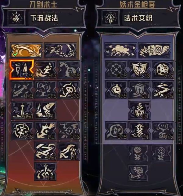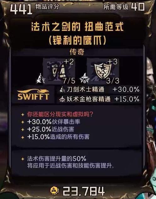 核心是刀剑的主动技能灵魂之刃,武器法术之刃使得近战可以多吃到法术伤害加成,金枪客2-2回盾直接不点保持全程破盾,铠甲扭曲范式使得高额的法术伤害再额外提升近战伤害、从而二次提升伤害,项链神木刷主动技能冷却。
