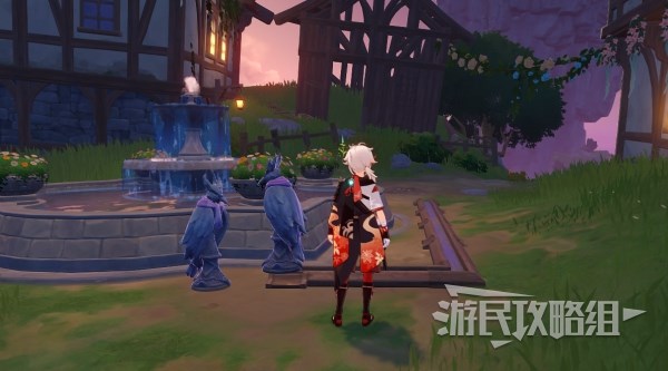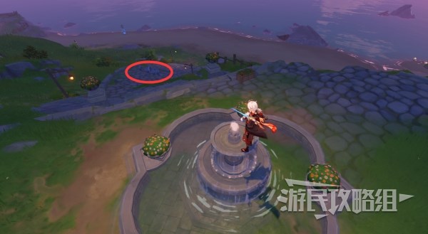初始位置在双双岛传送锚点北边,沿着石路走到喷泉旁边。