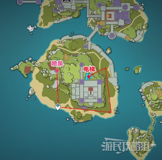 交谈完毕,按照下方图片所示路线从喷泉前往电梯处。