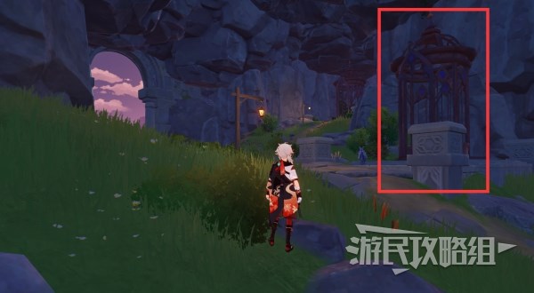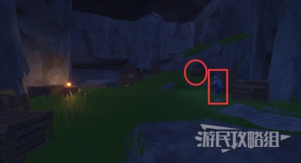 进入石洞后清理一堆丘丘人,可以看到鸦密欧就在旁边,宝箱就在隔壁。