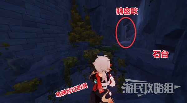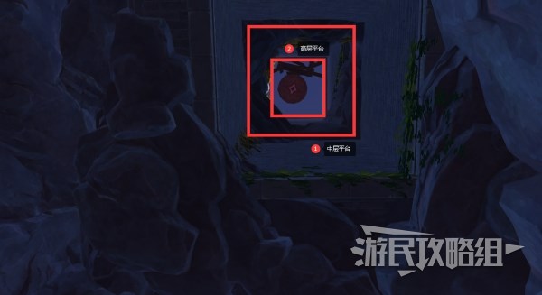 这部电梯会往上走,上升途中会经过一个石头平台,之后才会到达顶层。我们这里要在经过电梯石头平台时,从电梯中跳到石台上(石台位置参考下图①的方框),同时我们也会听到鸦密欧在附近呼救。
