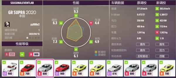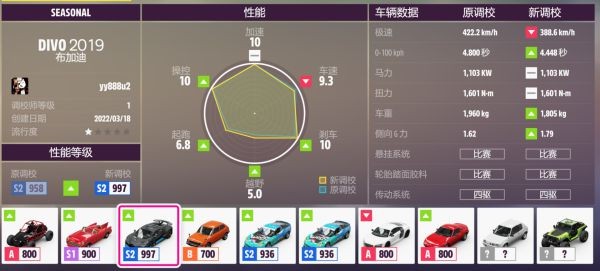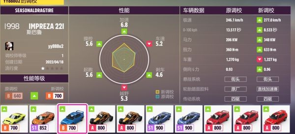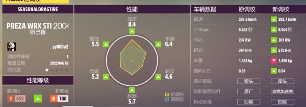 我也不是没想过调一个操控稳健,马力缩缩水的,只是觉得不喜欢。为什么不力大砖飞?(光头直线胎越野分比街胎还高,到底为什么,我不理解)何况这数据这么好看,楼上斯巴鲁看了都落泪。