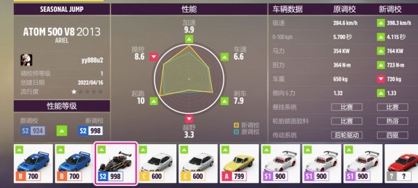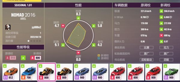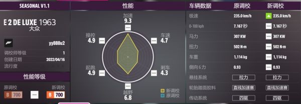 用越野胎分太低。直线胎在野地的表现出乎意料的ok,还比街胎低10分。所以直接用2级减重吧校车干到了307KW。这也是我这周第一次尝试直线胎所得的调教,我只能说力大砖飞,操控留点足够用就行。