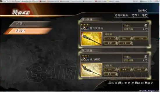 首先,打开CE,读取游戏,游戏里面进入自由模式,装备好想要修改的武器,然后打开一次选择,武将设定,武器设定界面,如图