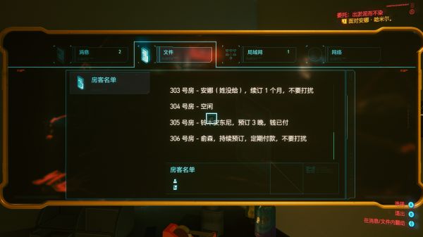 当然,这个任务还有别的完成方式,如果你的技术达到4,那么有扇管理员的门你就能打开,里面的电脑上有住户的清单,上面写着有安娜的名字,就能推测出好警察的房间号,从而也能推进这个任务。甚至你还可以通过无人的203房间,往上爬到303房间。因为303的正门默认是要技术6才能打开的
