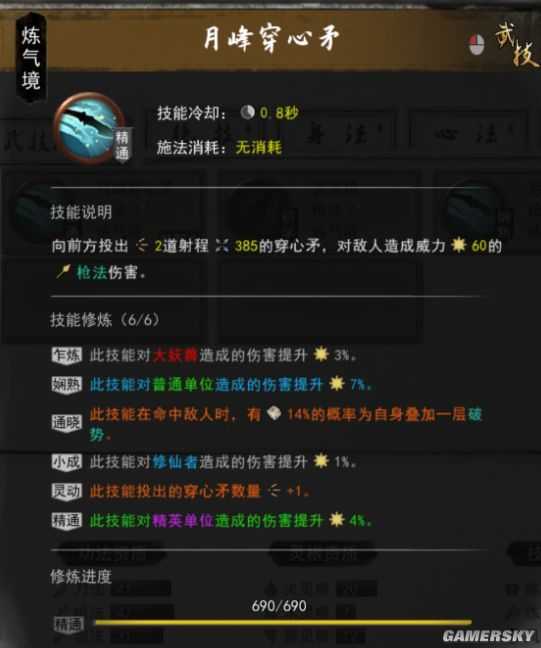 枪修练气期的普攻为穿心矛,弹道为弧线形,瞄准对方也可能打不到人。为了前期能舒服一些,补足伤害,我们这里这本武技的灵动期词条比较重要,最好是穿心矛加一,这样一次发射三根矛。因为发射的矛弹道不一样,多一根矛也能多一些打小怪的命中率,打大怪也能增加伤害,三根矛对比两根矛,相当于伤害加50%。